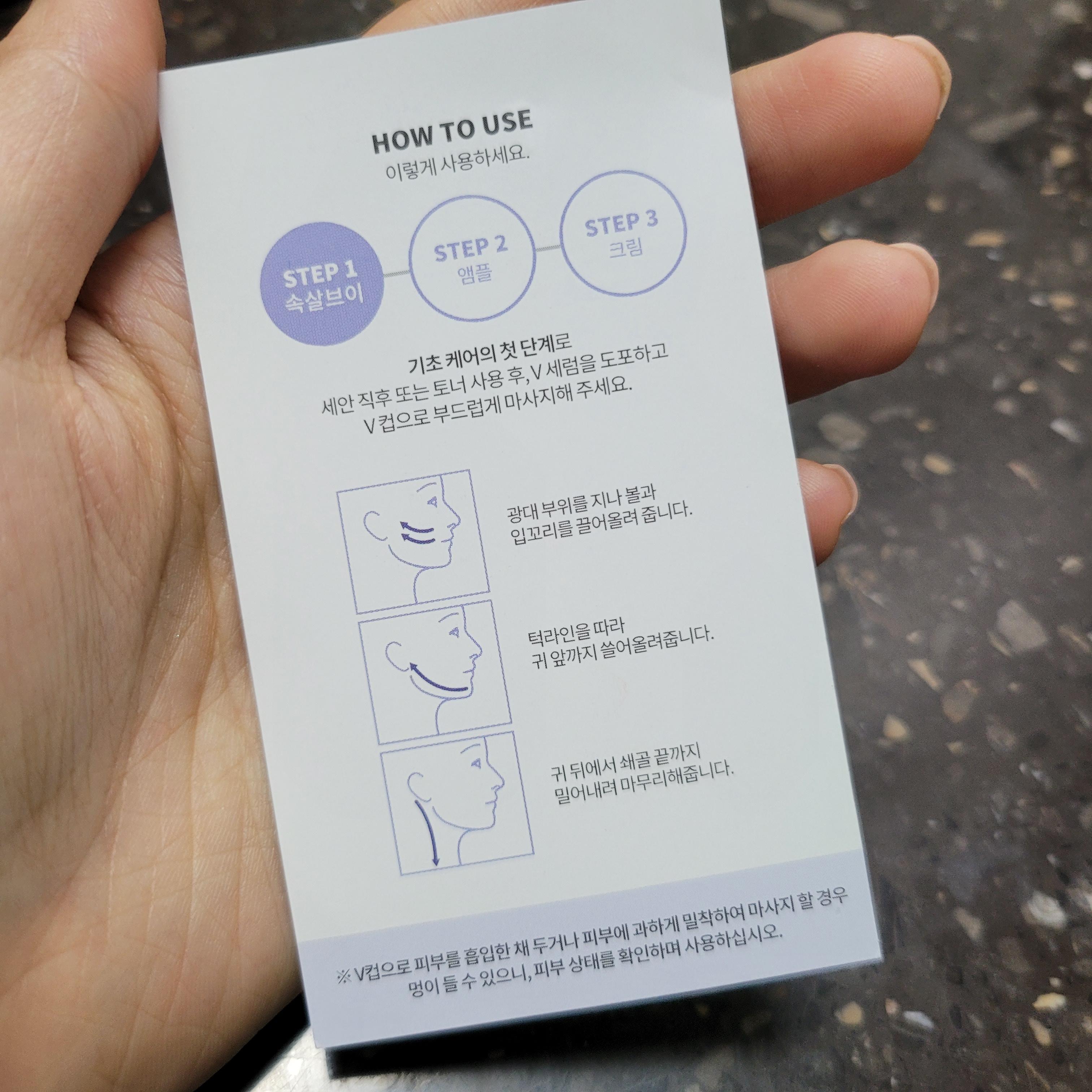 마사지를 하는 방법에 대해 상세한 설명서도 함께 들어있다. 나는 얼굴 비대칭도 심하고 턱선이 많이 흘러내린(?) 무너져있는, 그니까 한 마디로 탄력이 많이 떨어진 상태였기 때문에 반신반의 하고 그대로 따라해보았다. 특히나 나는 턱선뿐만 아니라 광대라인도 퍼져있어서 전체적으로 마사지를 다 해줬다. 이게 세게하면 압력때문에 피멍이 들 수 있다고 하는데 사실 나는 1달 동안 문질러대면서 피멍이 난 적이 한번도 없었다. 그렇게 많이 자극적이고 위험한 건 아니니까 걱정하지 않아도 될 듯.