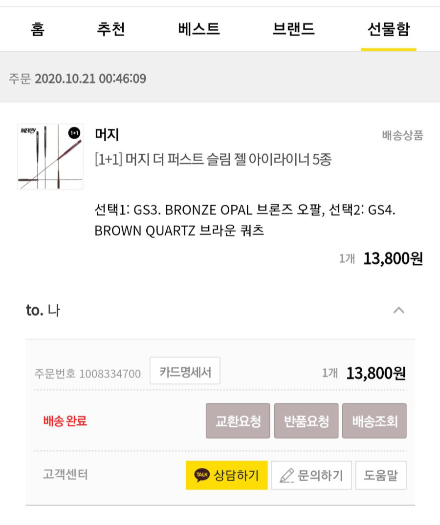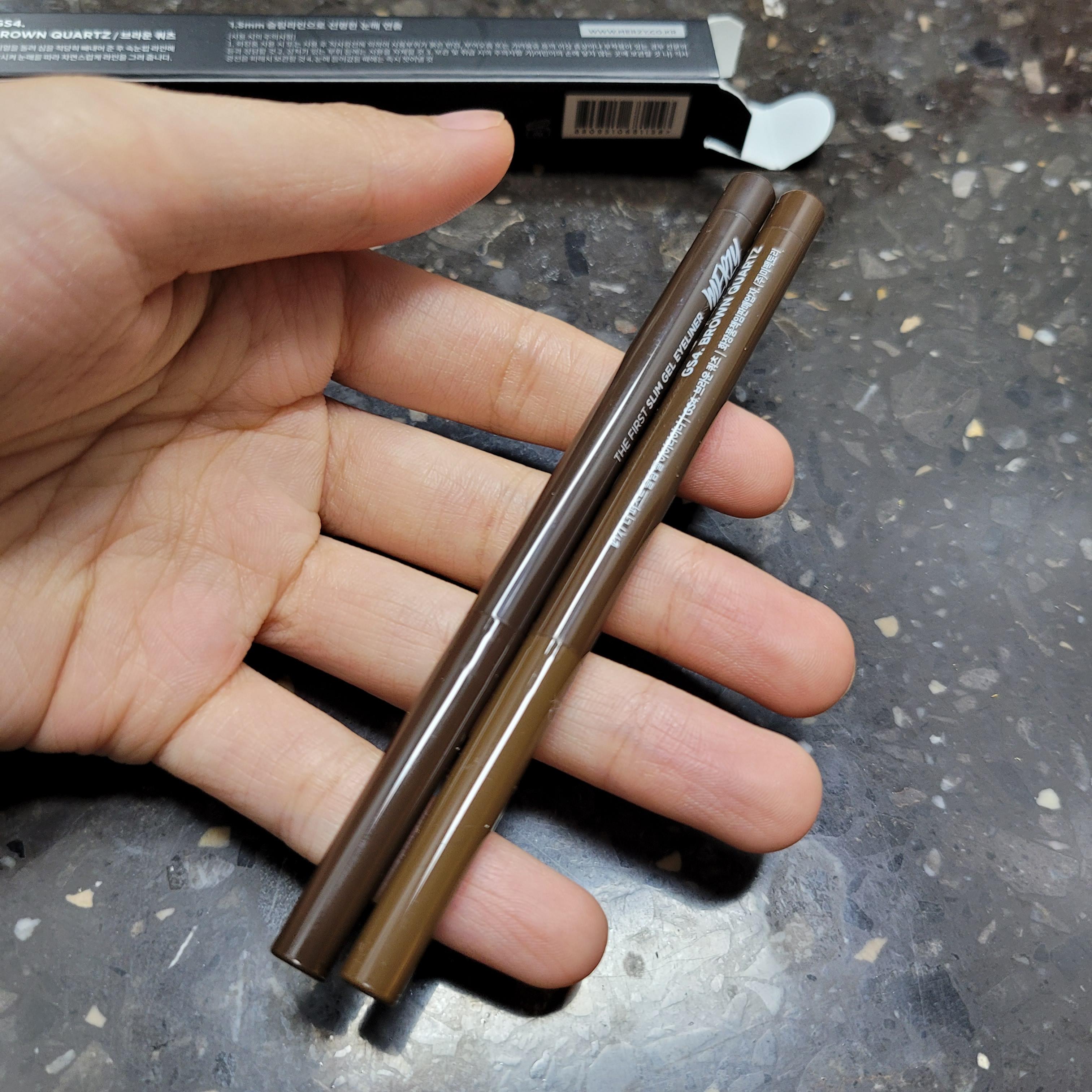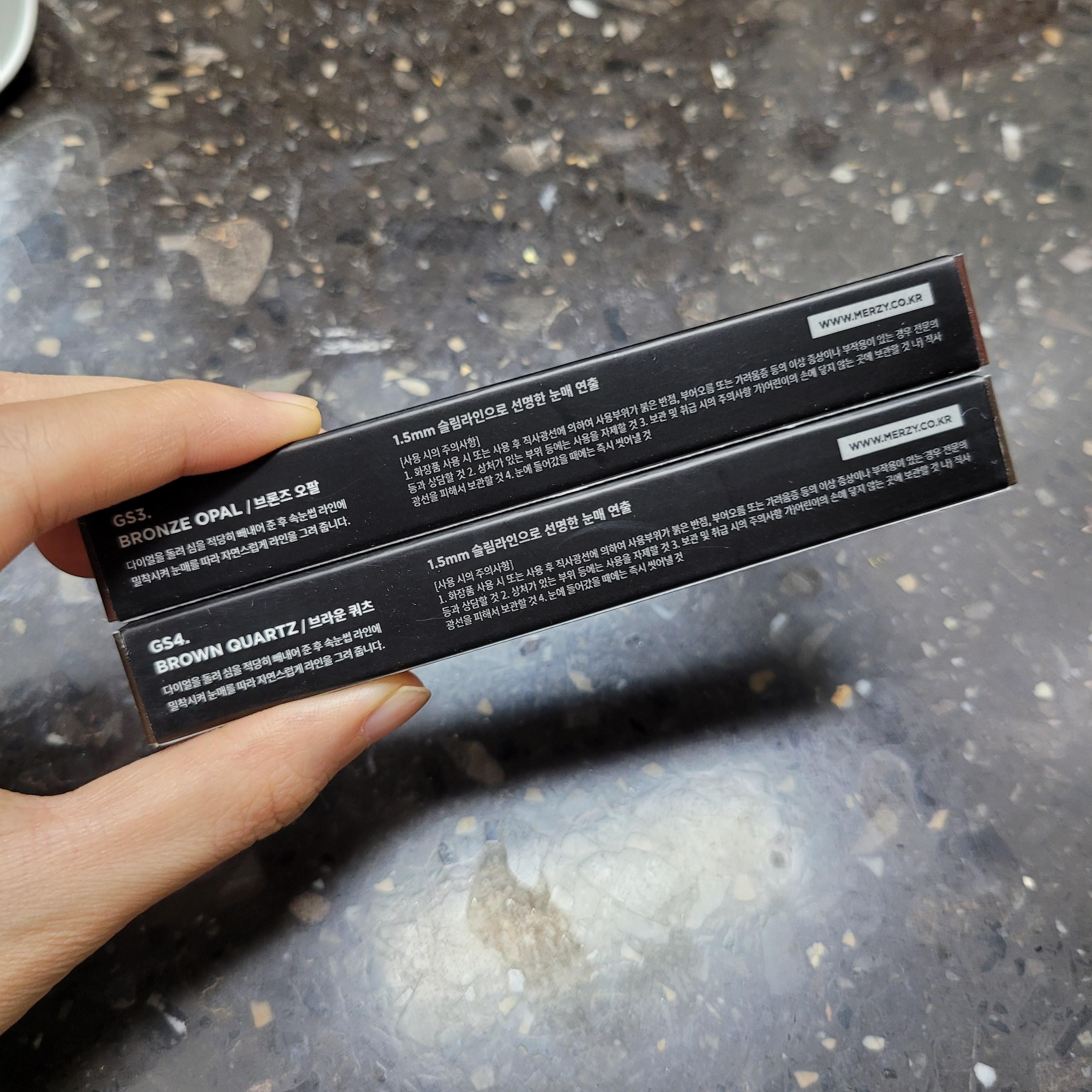더샘 에코 초슬림라이너 진짜 잘 쓰고 있었는데 어느 날 갑자기 사라져버림 (???) 그래서 아이라이너 요즘 좀 핫한 제품 어떤게 있나 찾아보니까 릴리바이레드아니면 머지꺼가 좀 괜찮다는 평이 있었다. 둘 중 하나 며칠 고민하다가 카톡 선물하기에 1+1에 13,800원 할인행사하고 있어서 그냥 쿨하게 지름. 개인적으로 나는 검정색 아이라이너는 사용을 안해서 무조건 (청순하고 그윽한 느낌을 준다고 느끼는) 브라운 컬러를 고집하는데, 총 5가지 색 중에서 브라운색상이 2개나 있어서 브론즈오팔 & 브라운쿼츠 이렇게 두 가지 색상을 주문해보았다.
