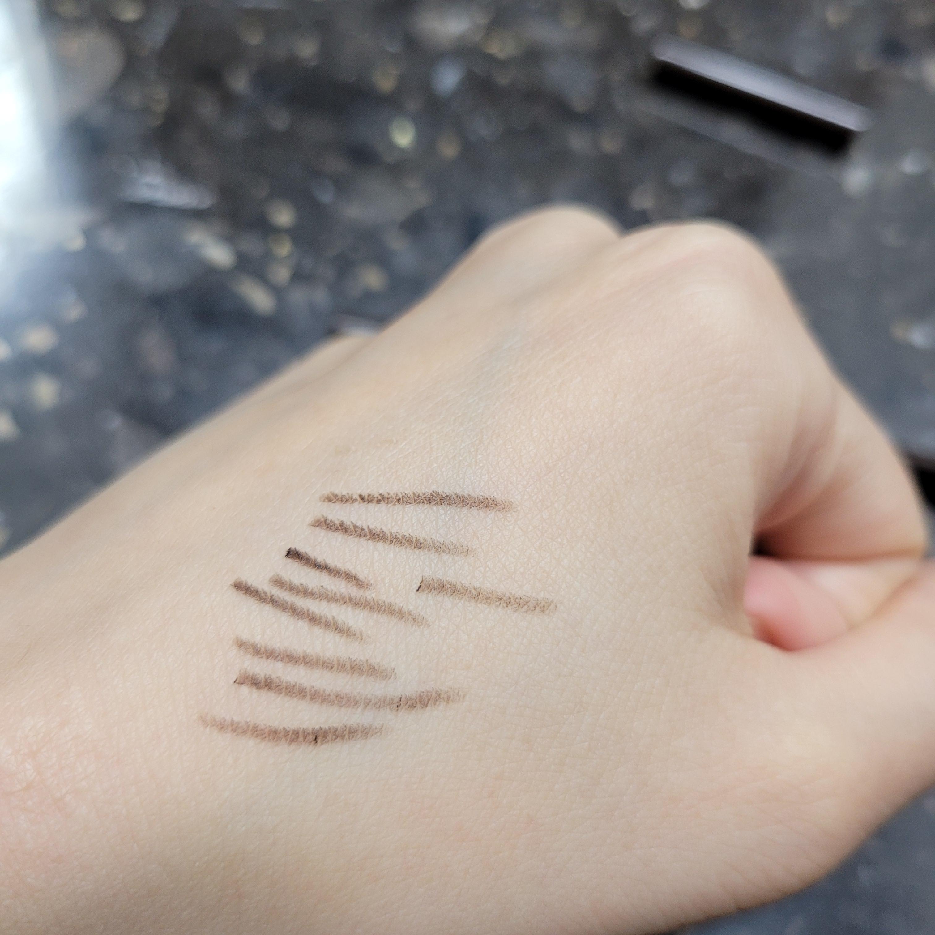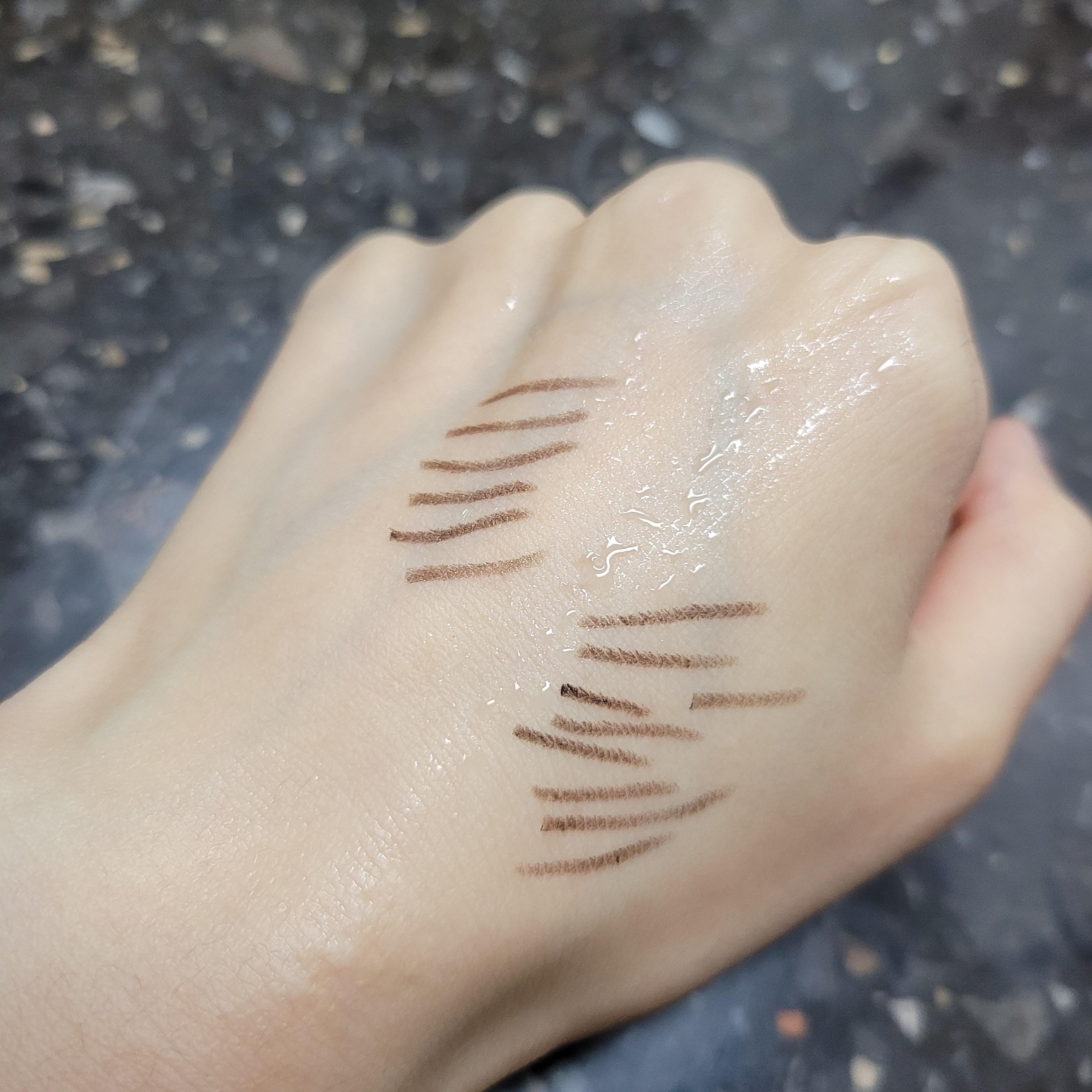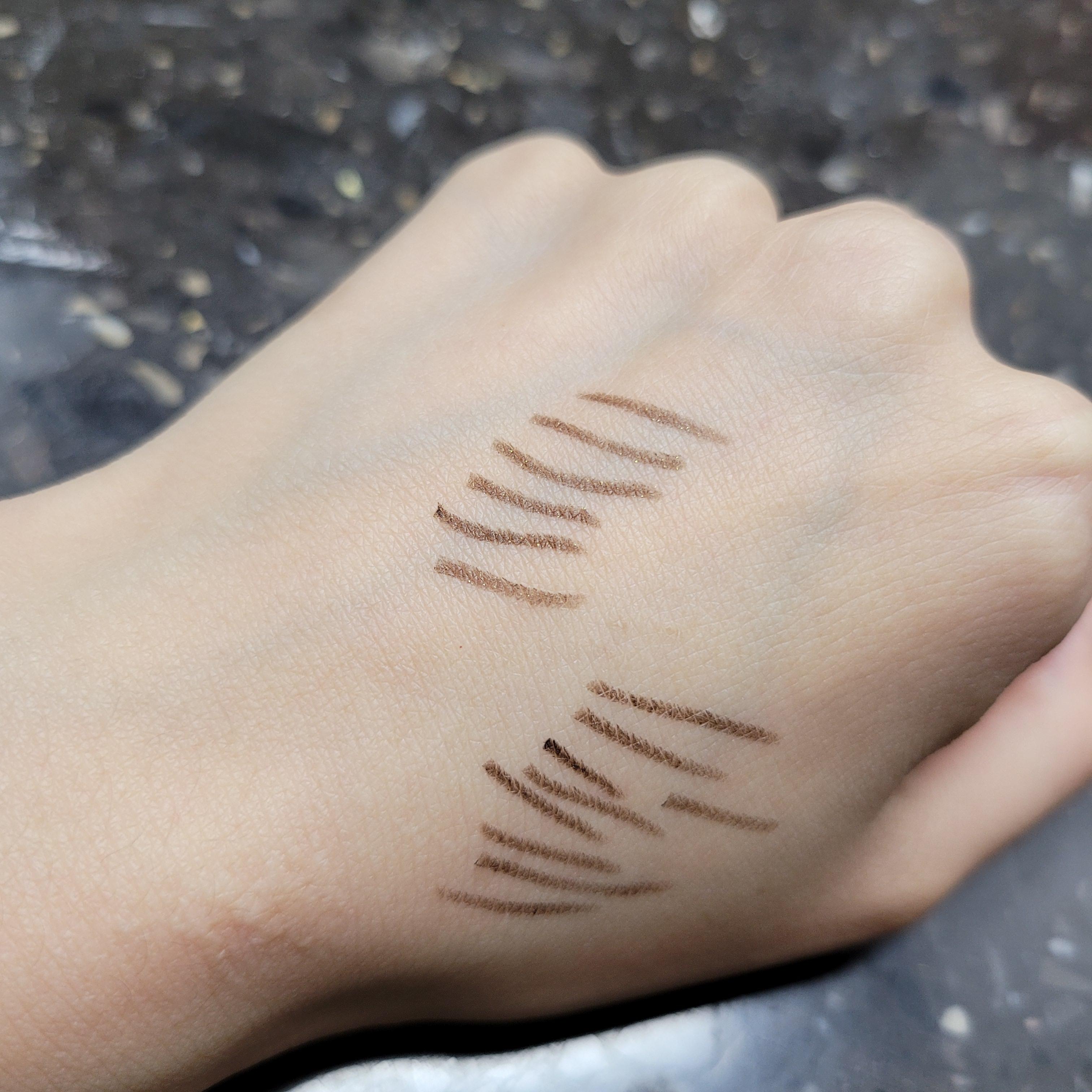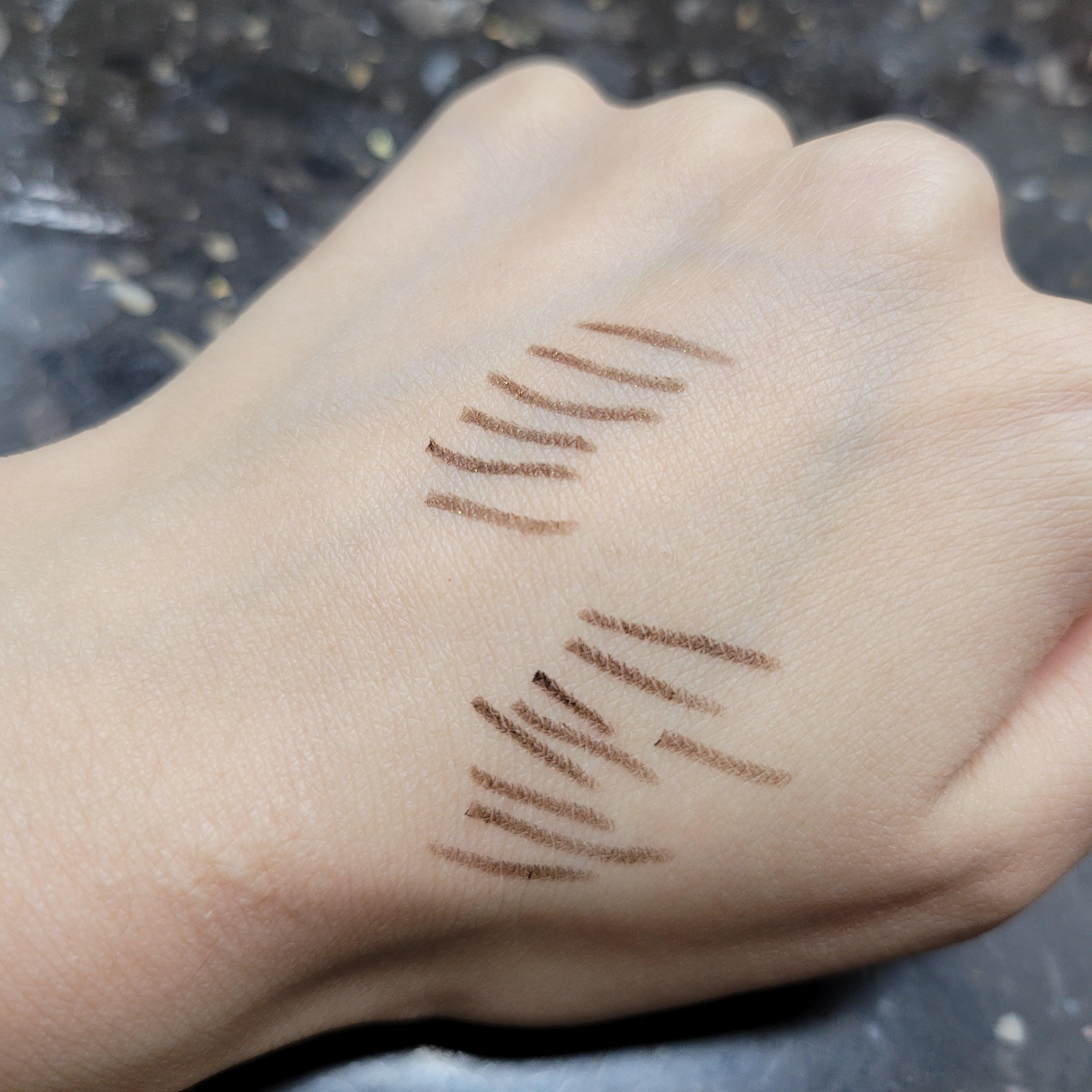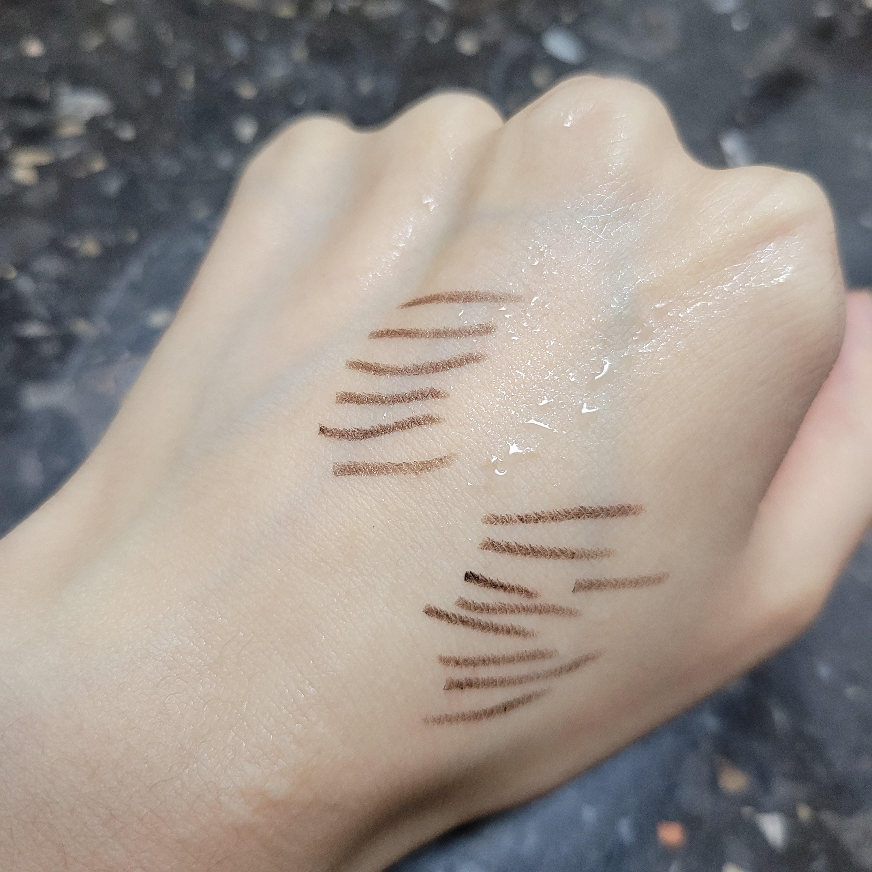 다음으로 브라운쿼츠를 바로 위쪽에 그려보았는데, 브론즈오팔이랑 크게 색상차이가 나지는 않아 보였고 다른점이 있다면 약간의 펄이 들어가 있어서 더 빤짝거린다는 점! 나는 개인적으로 이렇게 펄감이 들어간 아이라이너가 눈가에 발랐을 때 좀 더 촉촉해보이고 부드러운 인상을 주는 거 같아서 선호한다. 두 컬러중에서도 개인적으로 브라운쿼츠가 내 취향에는 더 맞았던 거로. 근데 크게 컬러감 차이를 느낄 정도는 아니었다. 그래도 어쨌든 브라운쿼츠가 좀 더 밝고 반짝거린다는 것.